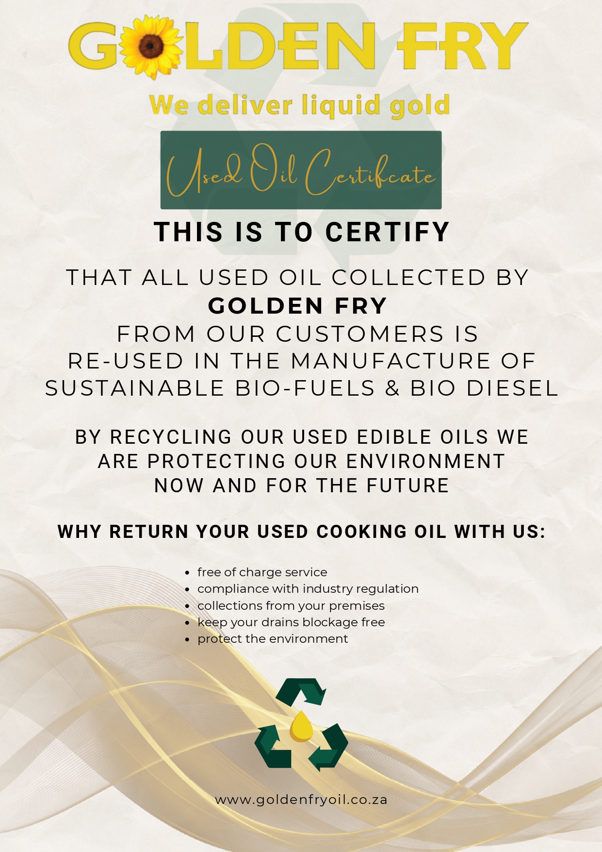 We offer an incentivised collection service for all used cooking oil supplied through Golden Fry. It’s simple, safe, and effective: